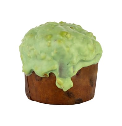 Recheado com mousse de pistache e parcialmente coberto com chocolate branco e pistache.