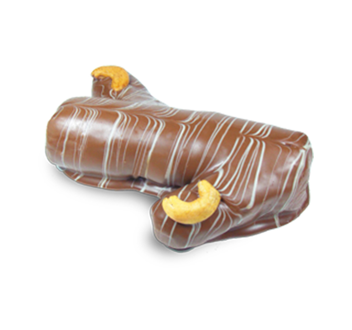 Massa de panetone com frutas cristalizadas, umedecido com licor de cherry e coberto com chocolate ao leite.